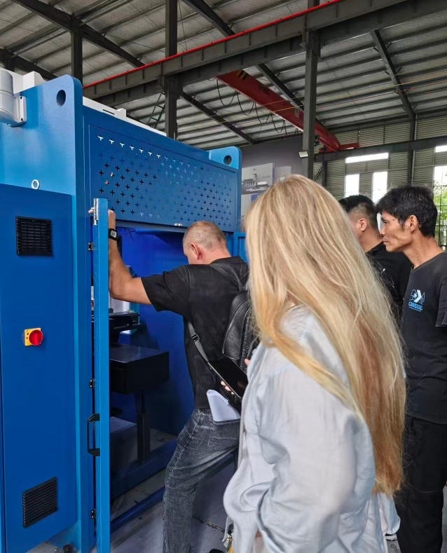 During the factory tour, the customer reviewed our production workshop, machining equipment, and assembly process. Our technical team provided a detailed introduction and live demonstration of the hydraulic press brake and CNC shearing machine, showcasing high precision, stable performance, and user-friendly operation.